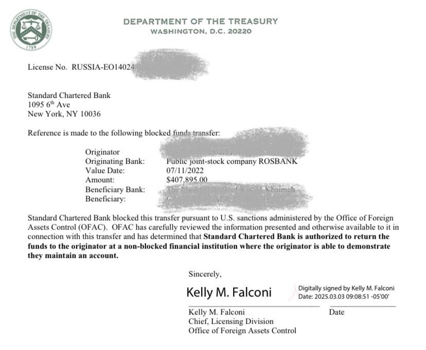 Успешное получение лицензии OFAC после первичного отказа. Разблокировка трёх коммерческих платежей.
